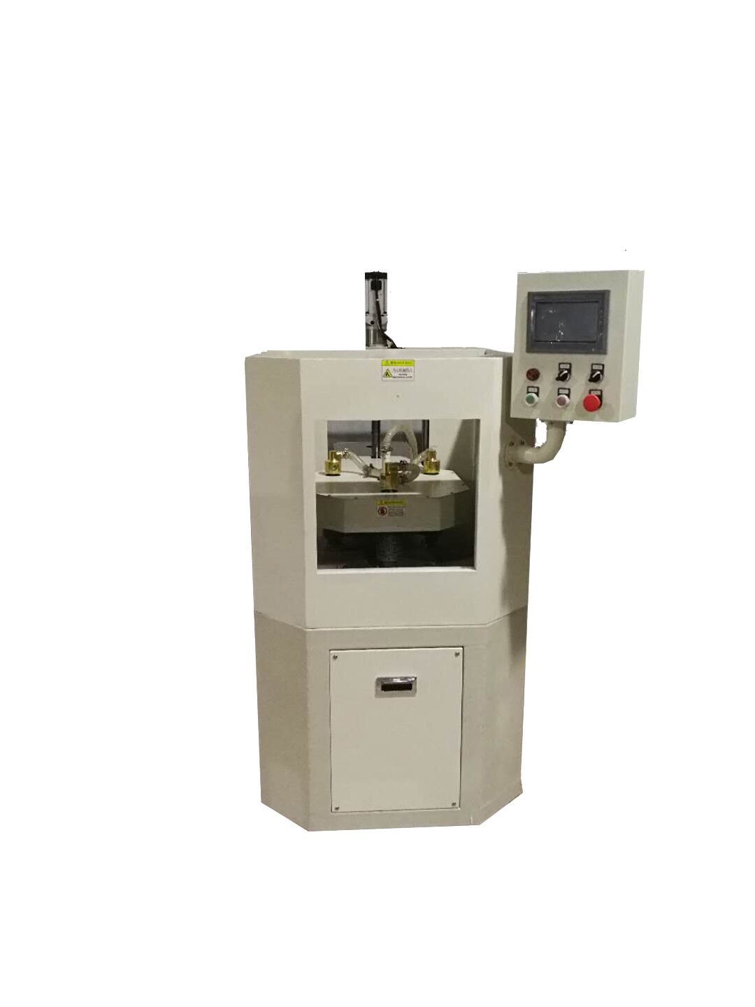 工作过程:经过防水处理的手机放在下盘,通过固定大小的卡槽固定。设定好参数后启动,上下盘以相反的方向转动,并且上盘向下运动,机器进入计时状态,达到设定正转时间后,上盘上升一段距离,然后上下盘反向转动,进入反转时间,打磨样品,反转时间结束后,一轮打磨过程结束。
